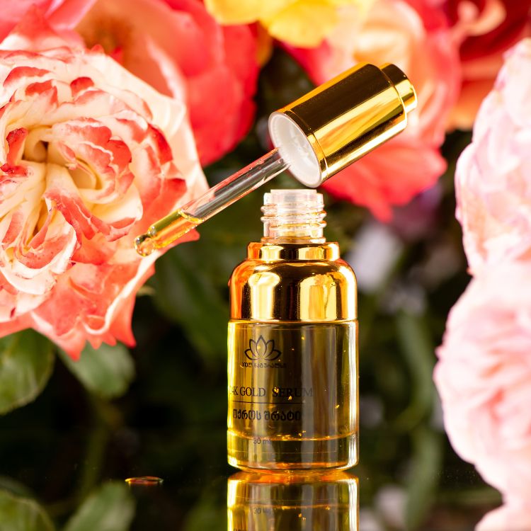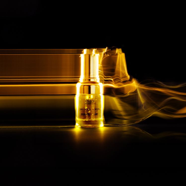Ingredients: 24 Karat gold particles, jojoba oil, rose water, vitamin A, vitamin E, fragrance. vitamin E, fragrance